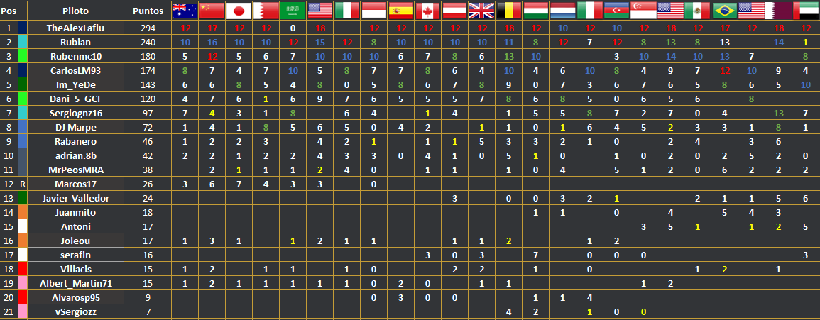Consulta la clasificación general de pilotos y constructores de la primera división del campeonato SoloF1.