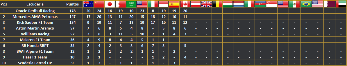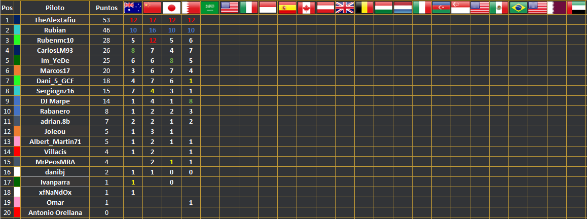Consulta la clasificación general de pilotos y constructores de la primera división del campeonato SoloF1.