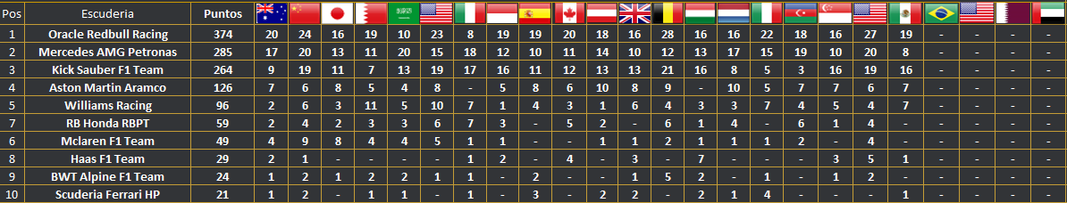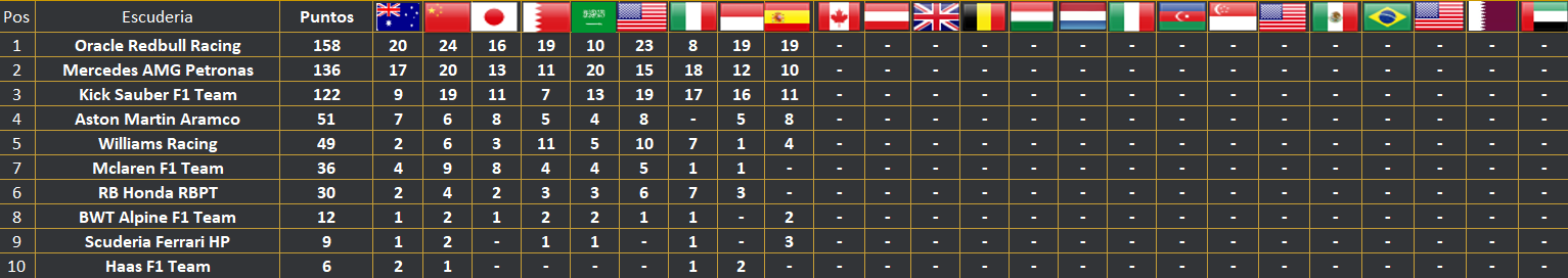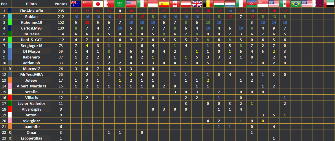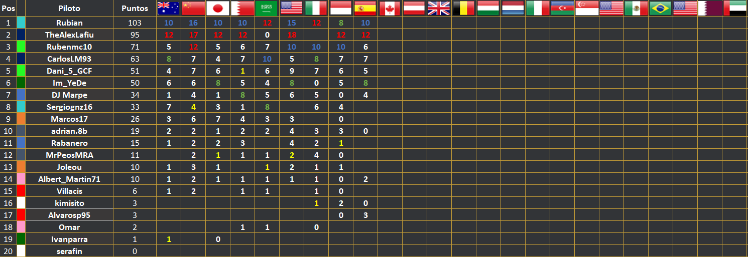Consulta la clasificación general de pilotos y constructores de la primera división del campeonato SoloF1.