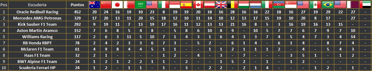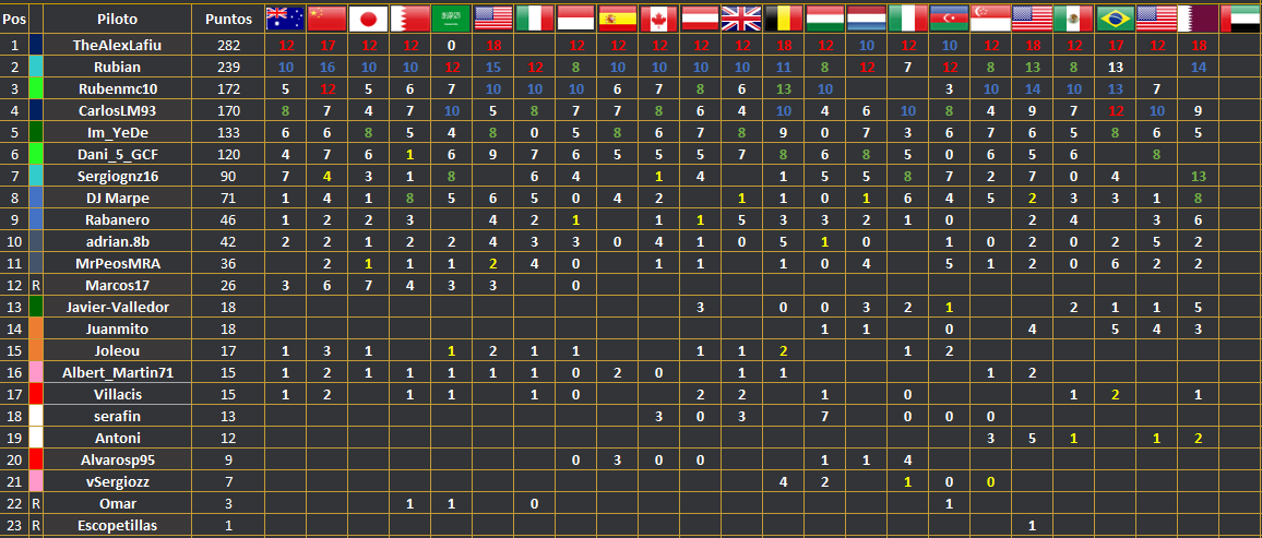 Consulta la clasificación general de pilotos y constructores de la primera división del campeonato SoloF1.