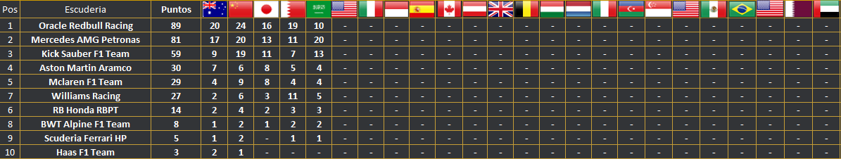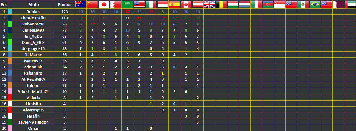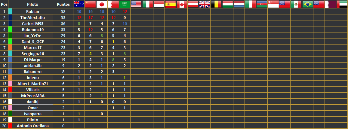 Consulta la clasificación general de pilotos y constructores de la primera división del campeonato SoloF1.